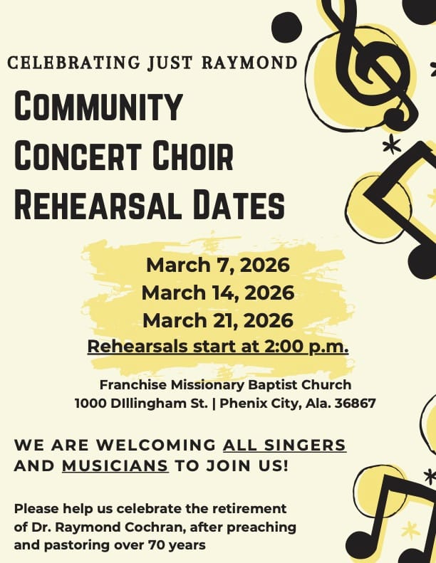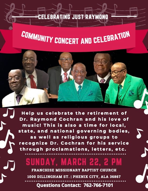 Franchise Missionary Baptist Church will host a Concert and Celebration at 2 p.m. ET Sunday, March 22, at the church, 1000 Dillingham St., Phenix City. The event will highlight Cochran’s love of music and lifelong ministry.