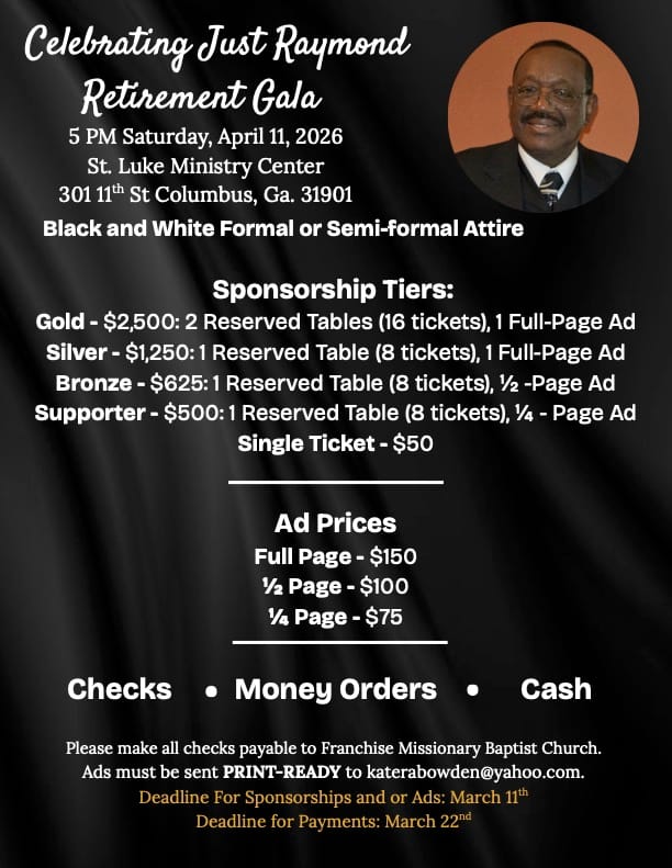 The celebration will culminate with the “Celebrating Just Raymond Retirement Gala” at 5 p.m. ET Saturday, April 11, at the St. Luke Ministry Center, 301 11th Ave., Columbus, Ga.